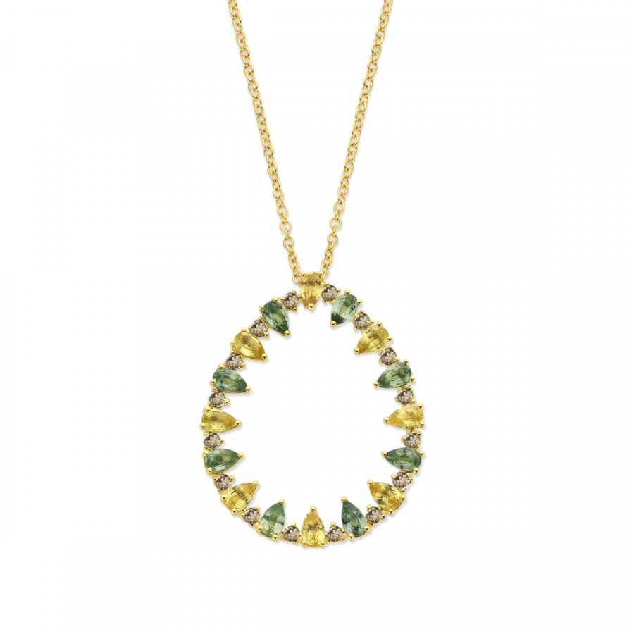 18 karaat geel gouden halsketting met bruine diamant, groene en gele saffier.